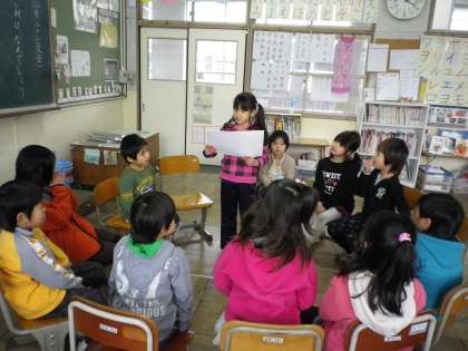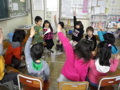 国語の時間に「これは,なんでしょう」の学習をしました。ヒントを出して,それは何なのかを当てます。「早く問題を出したい。」と,みんな大変意欲的でした。そして,授業が終わった後も,自分たちで問題を出し合って楽しんでいました。
