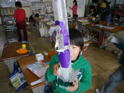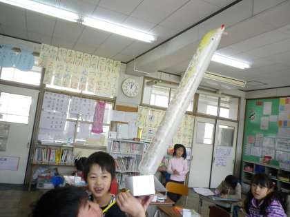 4時間目の図工です。箱の中からニョキニョキ。何が出てくるかお楽しみ。今日は,ふくろにストローを付けてふくらませました。みんな大喜びです。