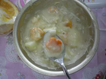 今日のシチューにも,しあわせにんじんが入っていました。今日は,お花のかたちでしたね。今日の給食も,美味しくいただきました。全員残さずに食べました。