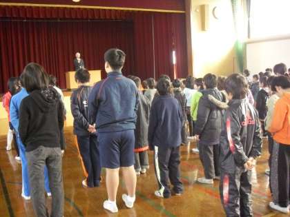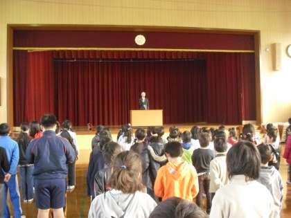 今年度最後の校長先生のお話の朝会でした。校長先生には「啓蟄」について,また梅の花など,春を感じる身の回りのことを教えていただきました。暖かさが増してくると,学年も次に進みます。しっかりとまとめをして,次の学年に備えるようにというお話を聞きました。