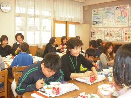 「6年生を送る会」の後,給食をランチルームで保護者の方といただきました。こんなふうに全員そろって学校で給食をいただいたのは初めてでしょうか?陶器の食器で賑やかにパクパクいただきました。とっても楽しく,そしておいしかったです。