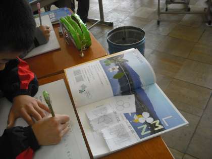 対称な図形の勉強をしています。半分に折って重なる形とまわして重なる形を見つけました。「対称」ってなんだろうと言うつぶやきとともに図形の学習をしています。実際に切ってまわしたり,重ねたりして重なることを確かめています。