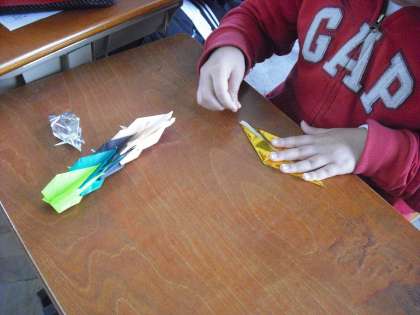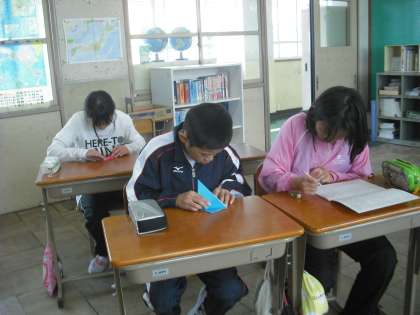 広島への修学旅行にむけて鶴を折り始めました。「千羽もおれるかなぁ。」と言いながらもせっせと折っています。放課後少し残って折っていると,訪ねてくれた卒業生も折ってくれました。