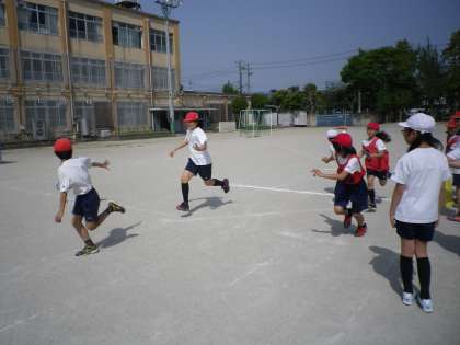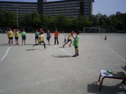 6年生とチームを組んでリレーをしています。初めてでしたが,バトンパスもうまく出来ていましたね。