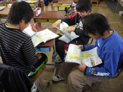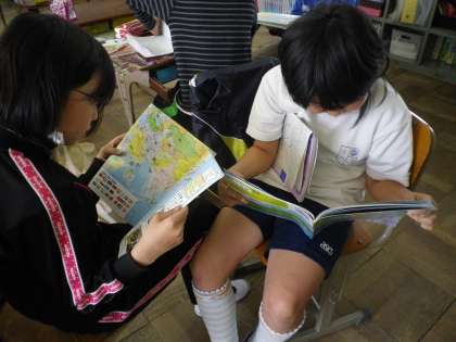 社会の時間です。地図帳をもとに作成したクイズを出し合っています。楽しそうに取り組んでいました。