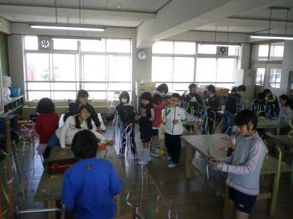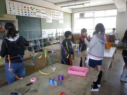 図工の時間に,「風が見えたら」をしました。1本のロープにかざりをどんどん付けていきます。