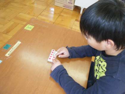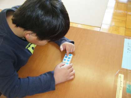数図ブロックを使って,5のかたまりをもとに,「5,678」というように,数え足しの練習をしています。
