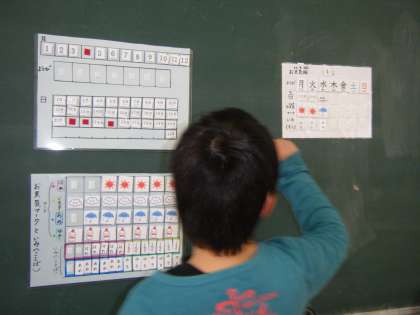 このように毎日,「お天気板」に「〜日」とお天気マークと意味のカードを貼っていきます。