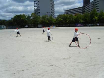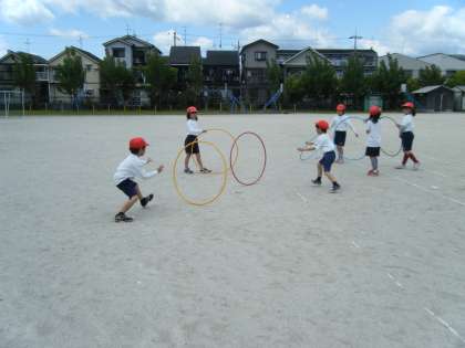 わっかを使って,跳んだり,転がしたり,友達と受け渡しを楽しみました。