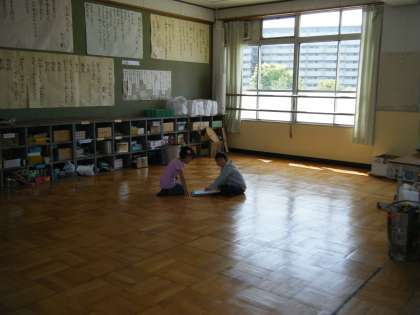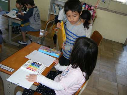 みんなで校内をまわった後は,1年生が教室で「見つけたよカード」を書き,2年生は1年生がわからないときにアドバイスをしました。