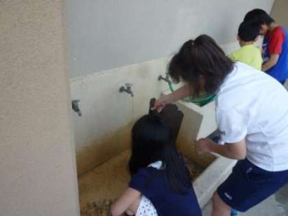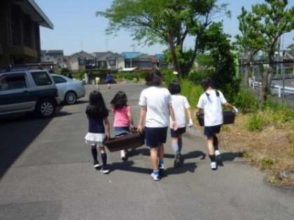 上級生のお兄さんや,おねえさんに教えてもらいながら,プランターを運んだり,あらったりしました。