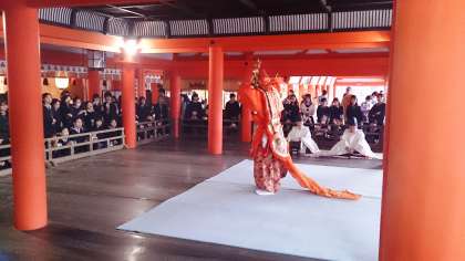 厳島神社を見学していると,中の方に今舞楽をしているからといわれ,見に行きました。朱の柱に囲まれた中で鮮やかな朱の衣装といかめしいお面!とても神秘的でした。人垣の間から子どもたちも一生懸命に見ました。新聞にも何人か書いていました。すてきな経験でした。