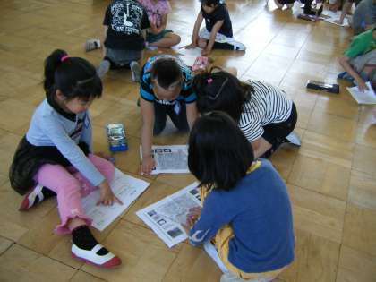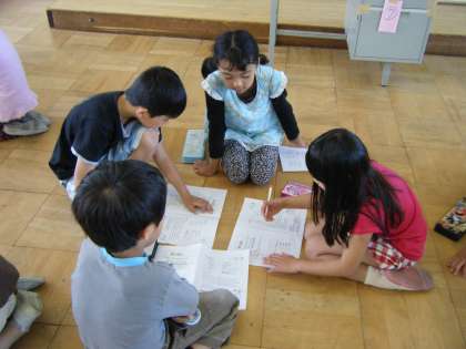 ドリームランドで,3学年が集まって遠足の事前学習をしました。当日,行動を共にするグループでめあてとコースを決めました。当日が楽しみですね!晴れますように!