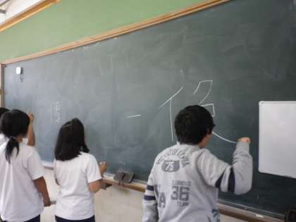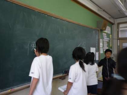 学習係が「漢字リレー」をしてくれています。決められた漢字を,1画ずつ順番に書いていきます。正しく書けたほうが勝ちです。