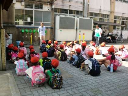 遠足に出発します。校長先生のお話を聞き,グループのめあてを確かめて出発しました。
