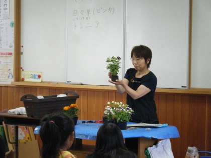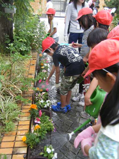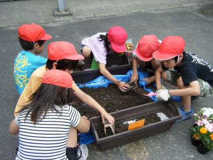 ランチルームで植物の生育に大切なことや,花の苗の植え方についてのお話を聞いてから,外へ出て,活動しました。土にしっかりと肥料を入れて,プランターに入れました。そこに苗を植えました。最後にたっぷりと水遣りをしました。これから,大切に育てていきたいです。