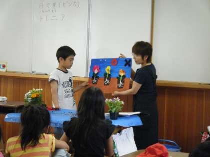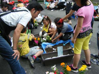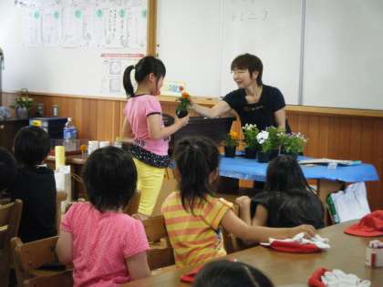 ランチルームで植物についてのお話を聞いた後,外で花の苗を植えました。土に肥料を入れて,しっかりと混ぜました。花の苗を大切に植えました。これから大切に育てていきたいです。