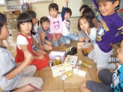 「まる」「さんかく」「しかく」の形の箱や空き缶を使って,みんなでお城を作りました。今週は,いろいろな かたちの勉強をします。