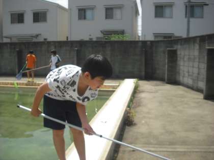 ヤゴを1年生と救出しました。例年は,プール横の木から葉が落ちてそれが栄養になるのかプールの底はにごって見えません。今年は木もなくプールの底がよく見えていましたら,やはりヤゴはあまり育っていませんでした。本日の救出は3匹でした。ちょっとさみしいヤゴ救出でした。