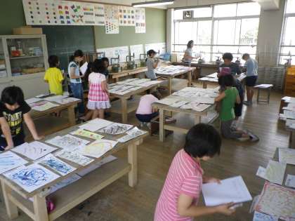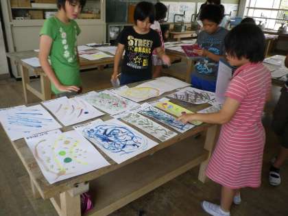 先日,図工で取り組んだ「気持ちを表す形や色」の作品を鑑賞しました。一人で何枚も描いたので,図工室の机が作品でいっぱいになりました。鑑賞後は,教室に,気に入った作品を3枚ずつ掲示しました。