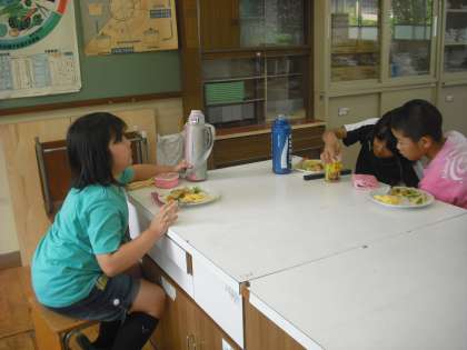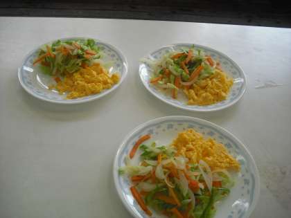 野菜いためもいりたまごもとってもおいしそうにできあがりました。味は,「薄味にしてください。」と伝えておいたので,薄味すぎたようです。持ってきた塩コショウを足して食べていました。しょう油で少し味をつけたほうがよかったかもしれません。