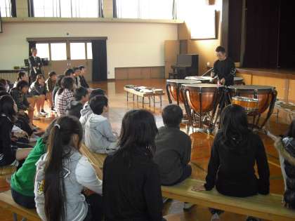 テインパニー奏者の奥村さんに来ていただき、音楽の授業を受けました。音楽の時間に学んだことにもっと幅ができる経験をさせていただきました。