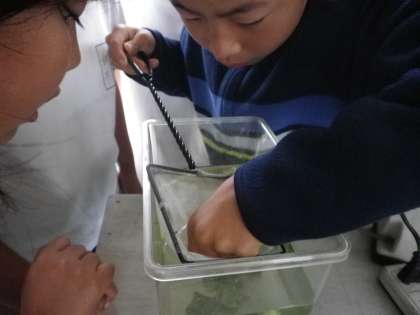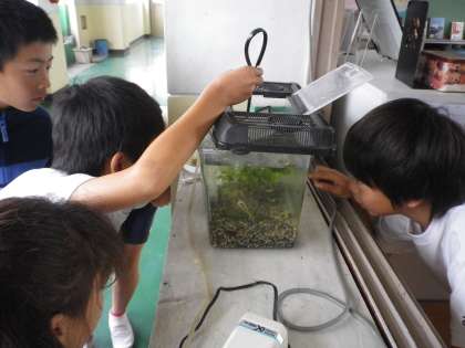 今朝,水槽を見ると,先週,別の水槽に移しておいた卵からめだかの赤ちゃんが誕生していました。そして,また,卵を発見!慎重に水槽に移しました。