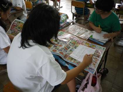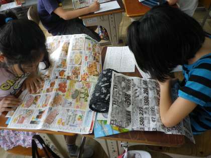社会の学習で,「食べ物のふるさと」を調べました。給食室のダンボールやスーパーのチラシから分かったことを,どんどんプリントに書いていきました。