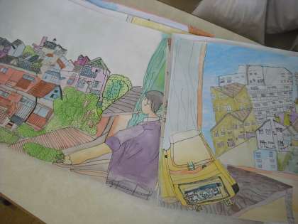 根気よく自分の町をつくっていきました。一人ひとりの窓からの景色は,同じ場所を描いていても個性が出ています。