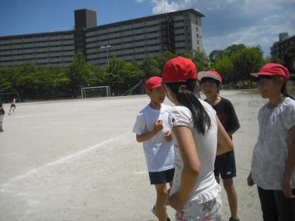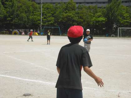 13日のカーッと暑い梅雨明けのような空のもと,キックベースをしました。チームを帽子で分かりやすく赤と白にわけました。暑いのにしっかりと遊んでいる姿はすてきでした。