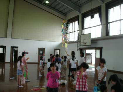 笹いっぱいにみんなの飾りがつきました。色とりどりの飾りがとっても笹に映えてすてきです。サァーと持ち上げると,折り紙の天の川がゆれていました。