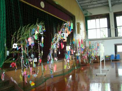 4日に一生懸命みんなで飾った笹飾りが,緑のネットにゆれてきれいでした。みんなで歌ったとても楽しそうな「怪獣のバラード」が体育館に響いていました。