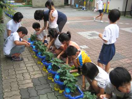 今日は,ミニトマトに追肥をやりました。子どもたちの植木鉢には