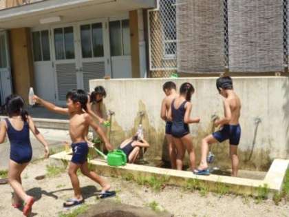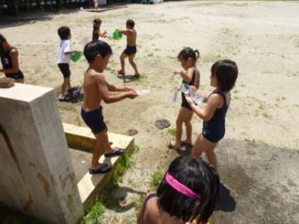 外は気温が高くとても暑いので,水で遊ぶのがとても楽しかったようです。