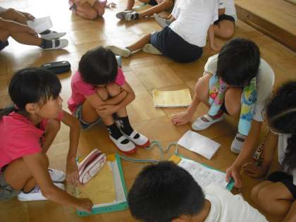 グループに分かれて 発表する内容を 相談しています。