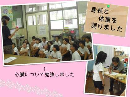 測定前に,心臓についての勉強をしました。低学年は「ドキドキかんじるしんぞう」という絵本を使って,高学年は,クイズやイラストを使って,どんなときにも動いている働きものの心臓についてお話しました。自分の体,自分自身を大切にしようと感じてくれればと思っています。