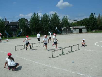 運動会に向けてハードルの練習も進めています。1・2・3・トン(ジャンプ)のリズムを大切にして跳んでいます。4年生が跳ぶときにはハードルの準備もします。こちらも手早くできるようになってきました。