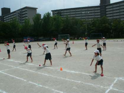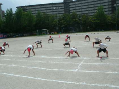 初めて運動場で練習しました。全校練習の後の3時間目でしたが,元気よく大きな声を出して迫力ある踊りができました。隊形移動など覚えることも多かったですが,集中して練習できました。
