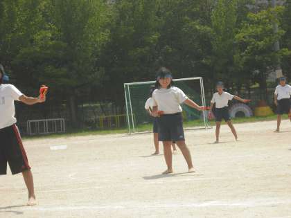 今日13日に初めて運動場に出て場所を確認しながら組体操をしたり踊りをおどったりしました。初めてにしては,とても場所を覚えてちゃんと並べました。暑いなかよく踊っていました。