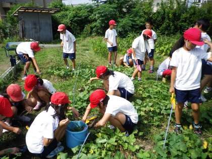 今日も暑い1日でした。午前中で水筒のお茶がなくなってしまった子も多かったようです。ふれあい農園の草引きも頑張りました。収穫の日が近づいてきましたね。