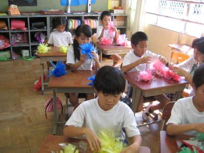今週はダンスの時に,体につけるかざりを作りました。赤・青・緑・黄色のポンポンを手足につけて踊ってみると,色あざやかでとてもきれいでした。運動会当日をお楽しみに!