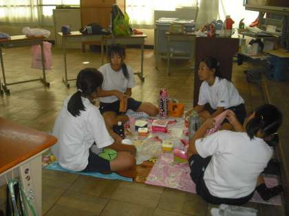 男女に分かれてお弁当をたべていました。大きなお弁当の男子。かわいいお弁当の女子。とてもおいしそうなお弁当でした。ゆっくり味わって楽しんでいました。