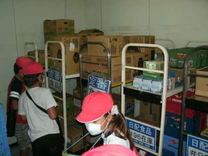 売り場を見学したあとは,普段は入れない店の作業場所を見学させていただきました。様々な商品が保管してある冷蔵庫や冷凍庫はクラス全員が入れるほどの大きさでした。また農産品や水産品の作業場では,清潔に気をつけた格好で作業されていること,商品を自動で素早くラップする機械があることなどを見せていただきました。