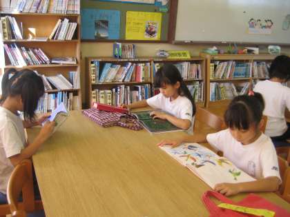 木曜日の朝の読書の時間は,1年生といっしょに図書室で本を読んでいます。図書室においてある本を借りたり返したりするよい機会になっています。