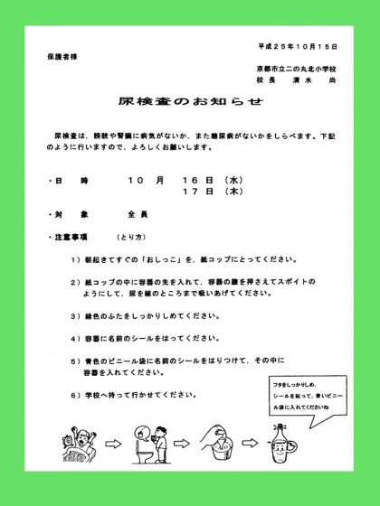 10月16日・17日は,秋の尿検査があります。本日お子さまに,プリントと検査の容器をお渡ししていますので,朝起きたらすぐに検査を実施していただきますようお願いします。