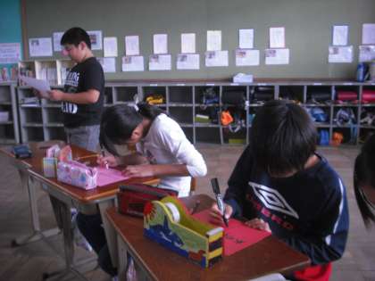 工夫して夏休みまえから取り組んでいたテープカッターを飾りました。名前と作品のイメージを書いて後ろに飾りました。木の切り方や絵が個性的です。