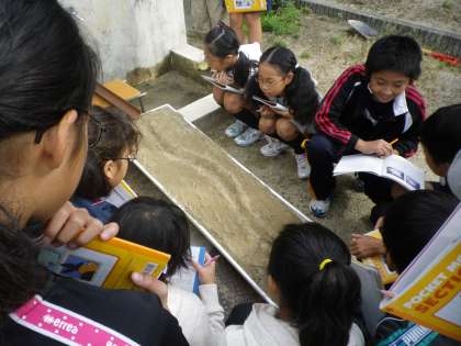 今日は外で流れる水の働きの実験をしました。そして気づいたことをノートにまとめました。