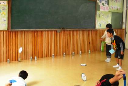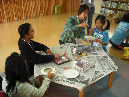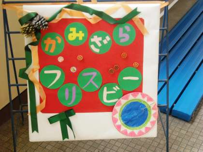 紙皿に思い思いの絵を描いたり,飾りを付けたりして,オリジナルのフリスビーが完成。できたフリスビーで的あてを楽しみました。
