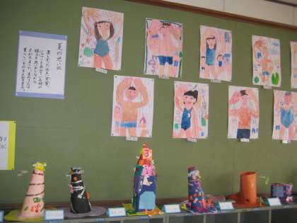 教室の後ろの掲示板には,「夏の思い出」を描いた作品を掲示しています。また「ぼうしをつくろう」で取り組んだ作品も展示しています。これらの作品には,自分の好きなものがたくさん描かれており,その子らしさが伝わってくる作品です。