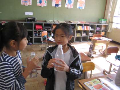 生活の学習では,身近にある材料を使って楽しく遊べるものを作っていく学習を進めています。今日は,ペットボトルをふくとどんな音がでるのか試してみました。息の吹き方を変えてみたり,水をいれてみたりしていろいろな音を子どもたちは楽しみました。